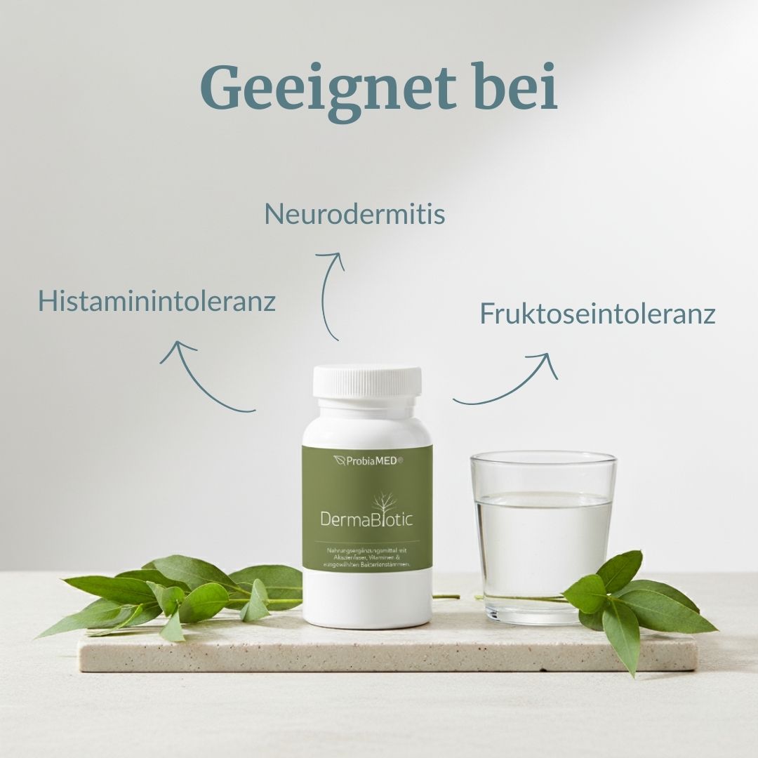 DermaBiotic enthält speziell ausgewählte Bakterienstämme, die in Studien gezeigt haben, dass sie überschüssiges Histamin im Darm abbauen